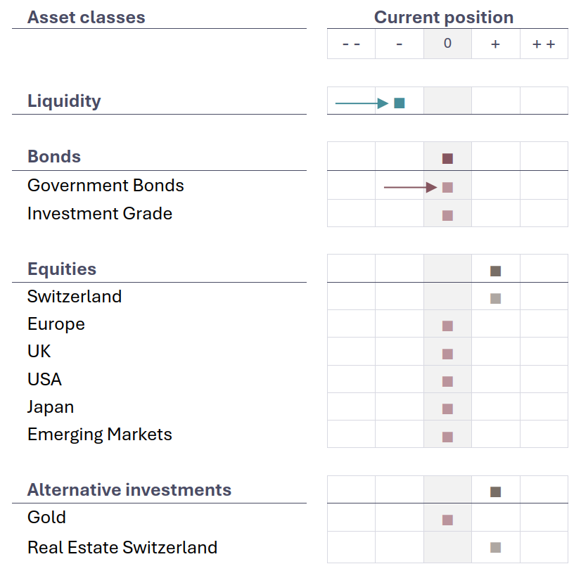 The tactical changes concern the slightly reduced underweight in liquidity and fixed income. The cut in global government bonds (mainly U.S. Treasuries) is more than offset by a further increase in emerging markets debt. We remain cautious in CHF and EUR as we see little upside. Overall, we are now back in a neutral position.
